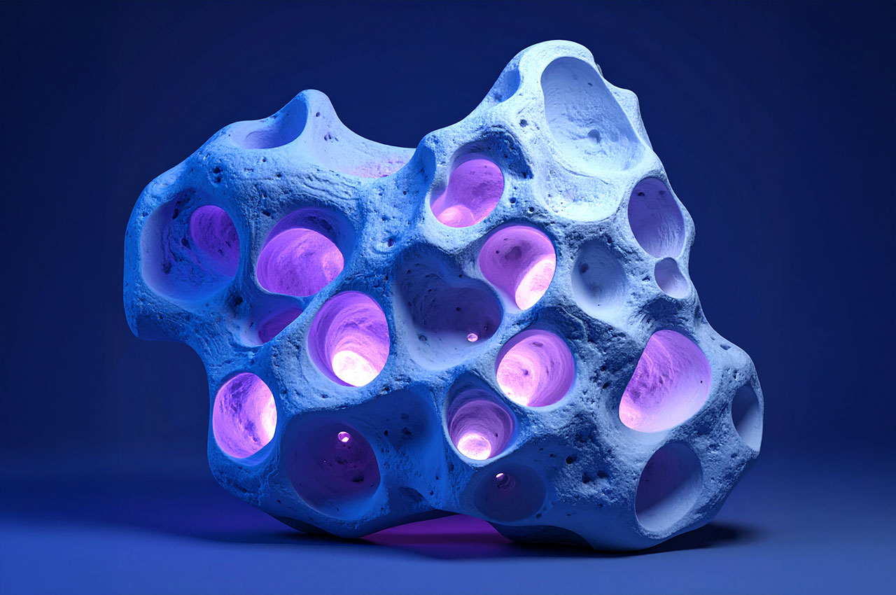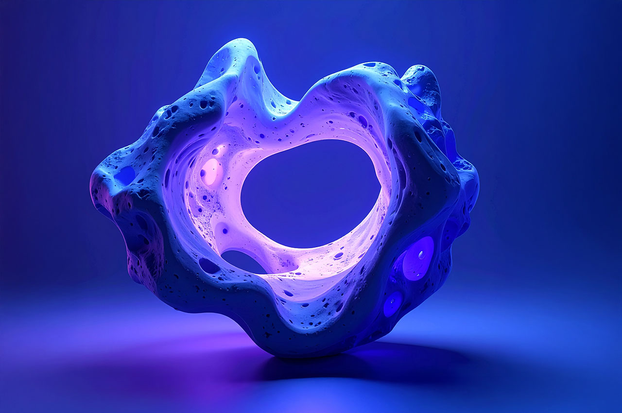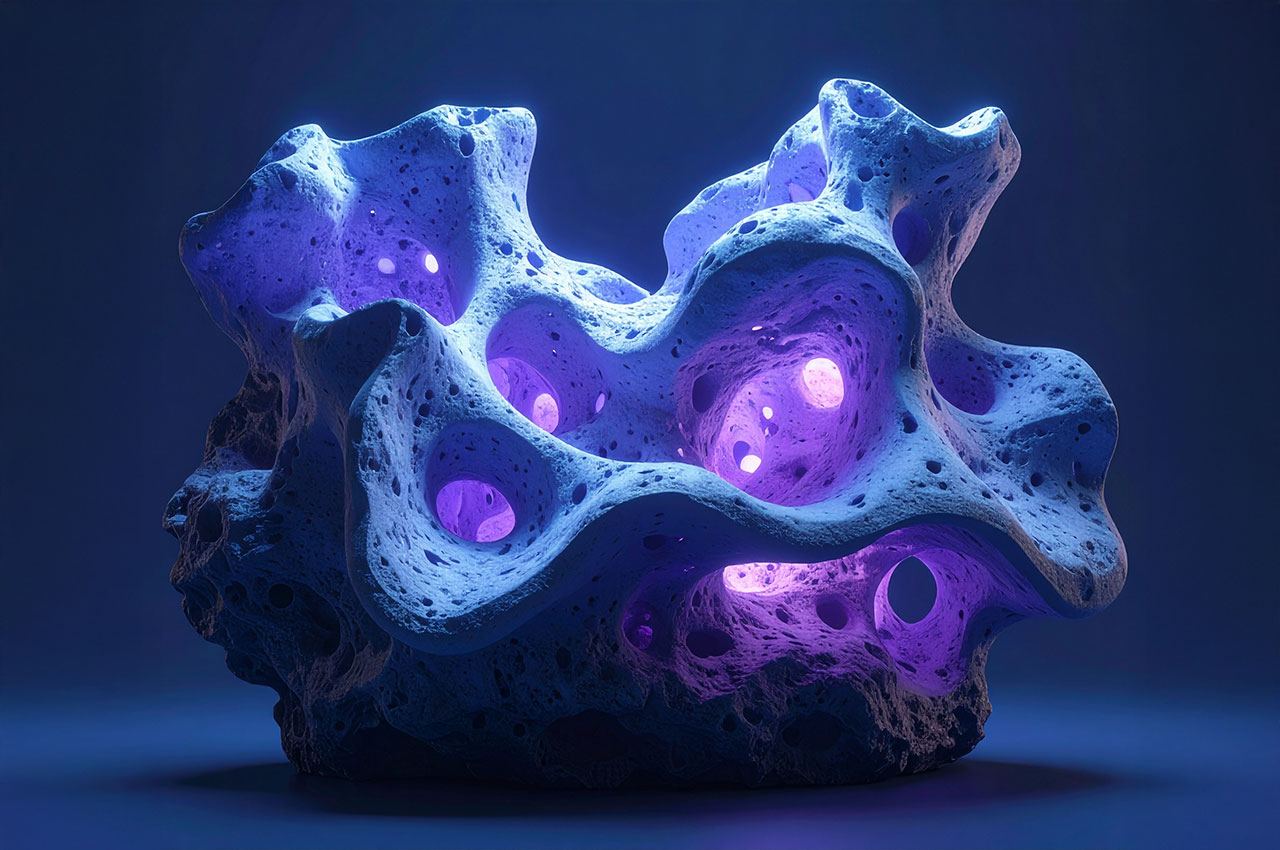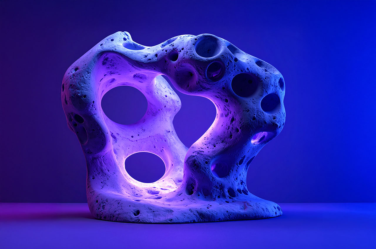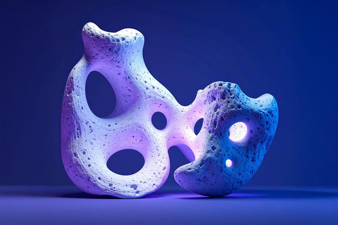 Die Formen erinnern an Korallen, Meteoriten, Knochenfragmente oder an von Wasser ausgehöhlte Steine – doch sie tragen die glatte Präzision einer digitaler Skulptur.