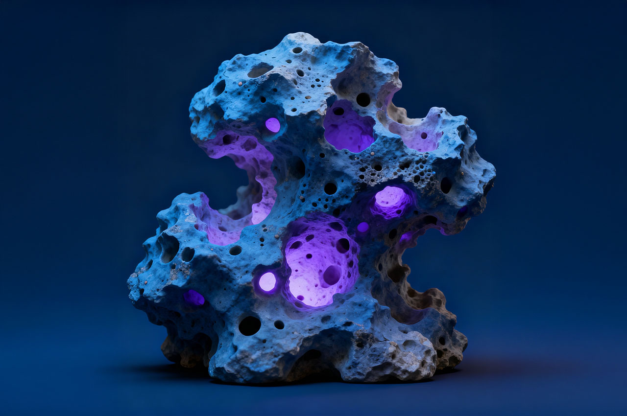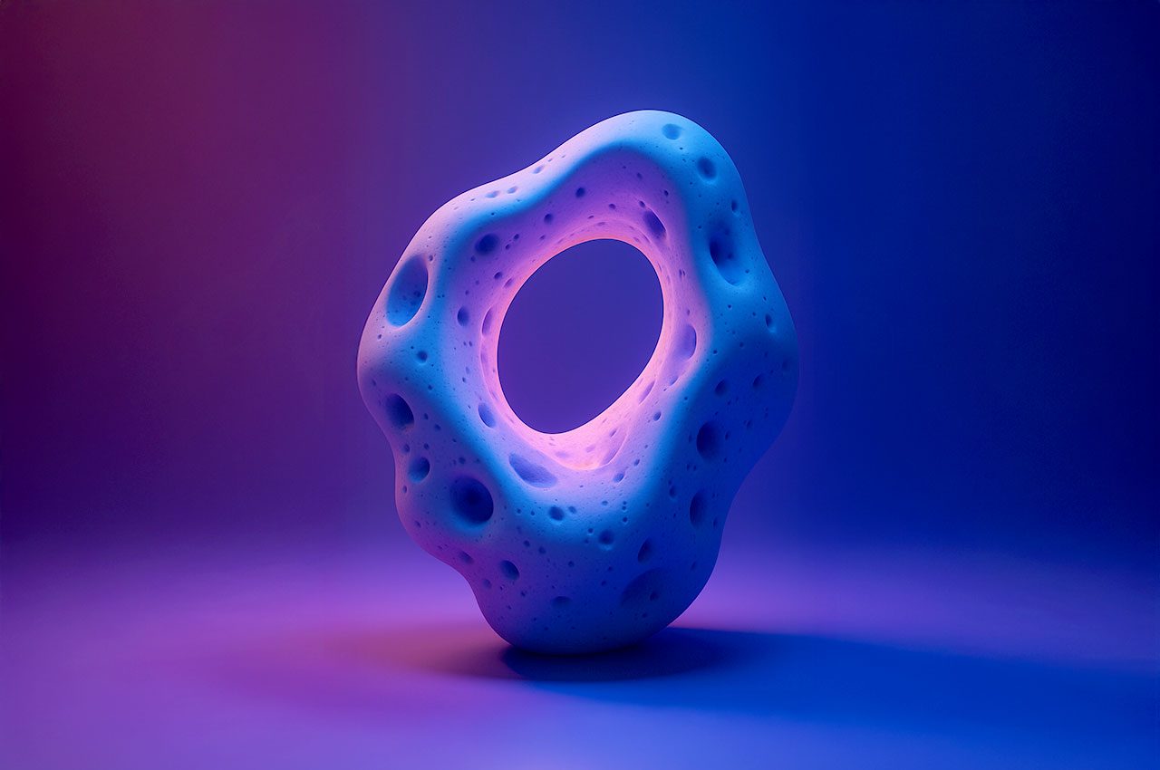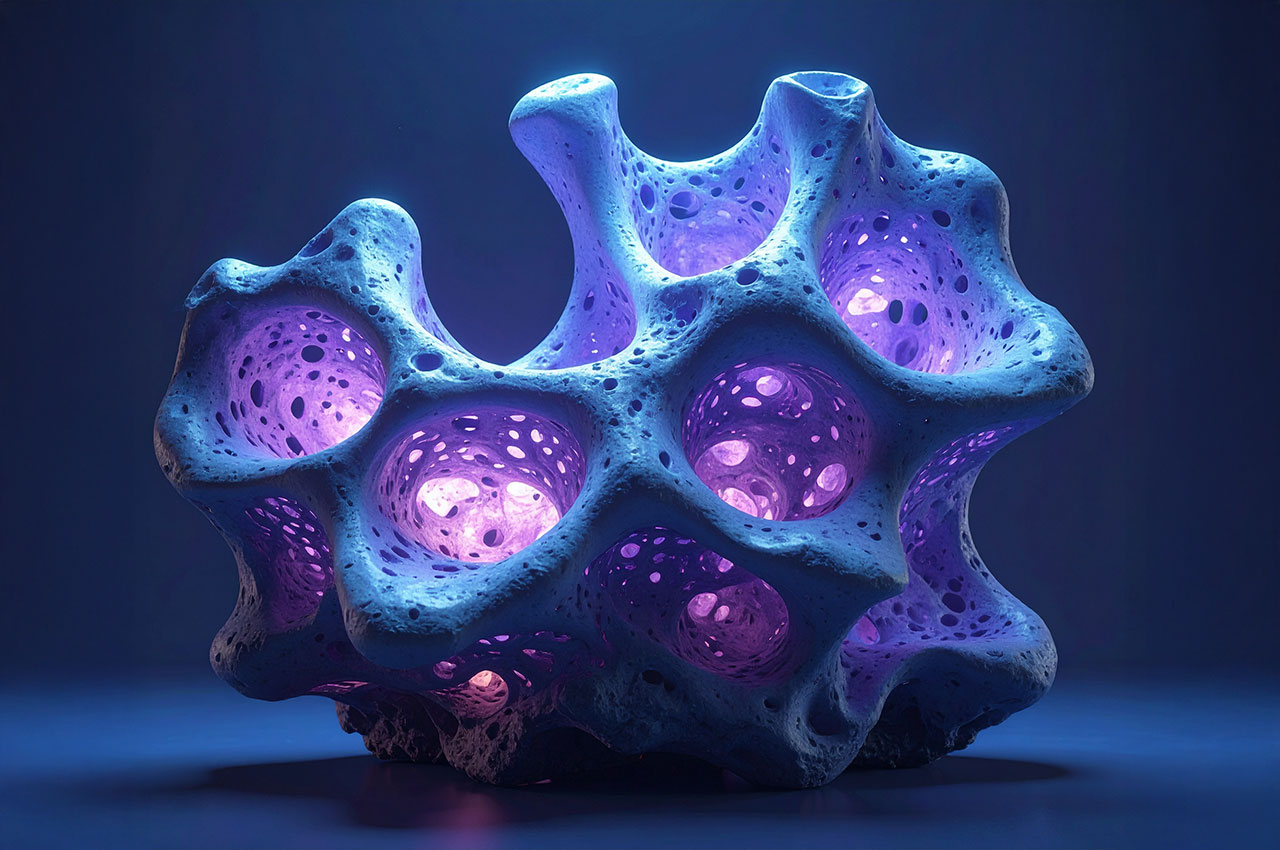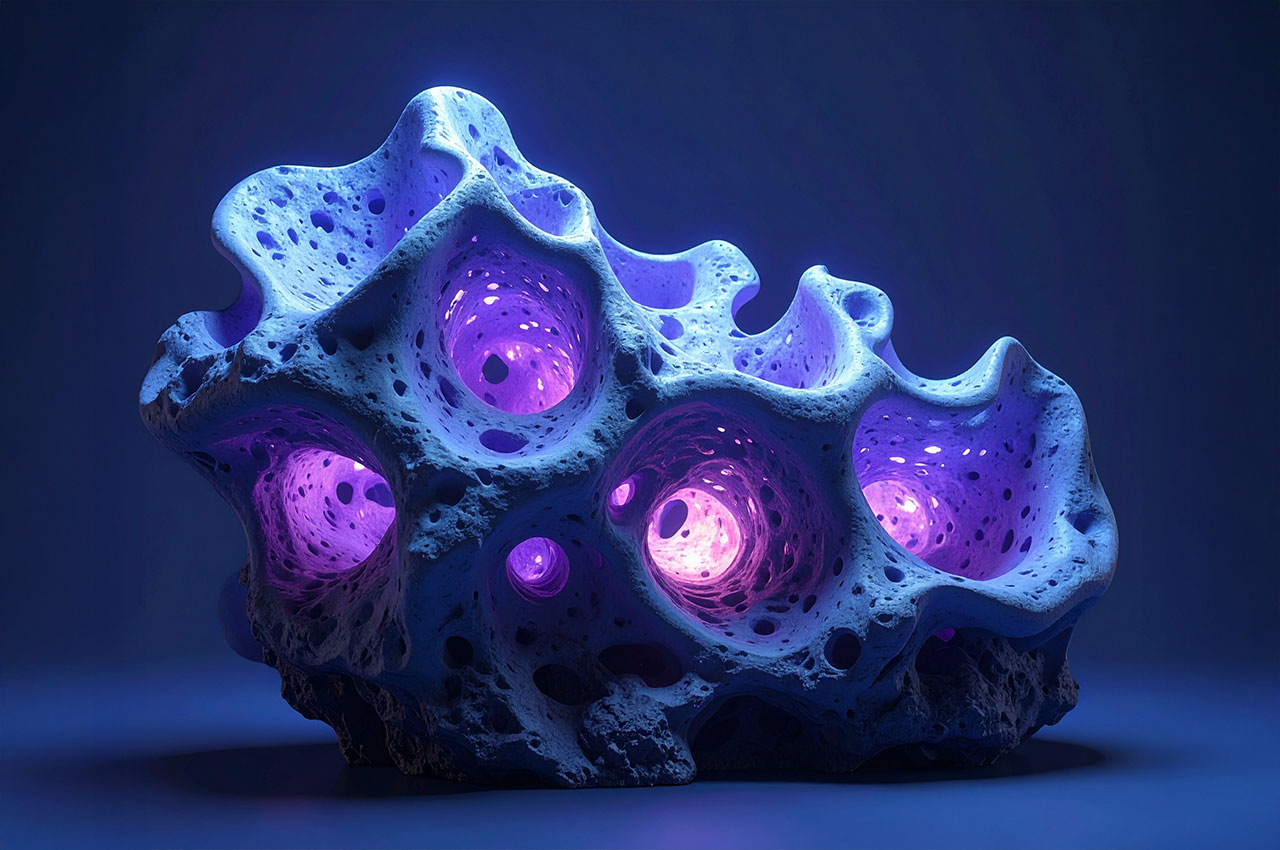 Die Formen erinnern an Korallen, Meteoriten, Knochenfragmente oder an von Wasser ausgehöhlte Steine – doch sie tragen die glatte Präzision einer digitaler Skulptur.