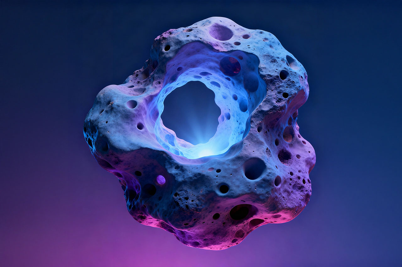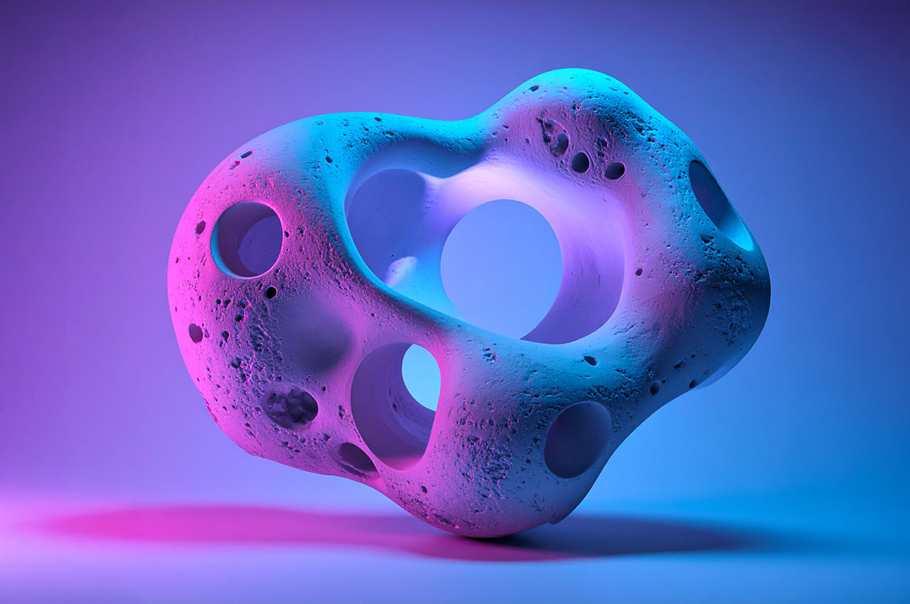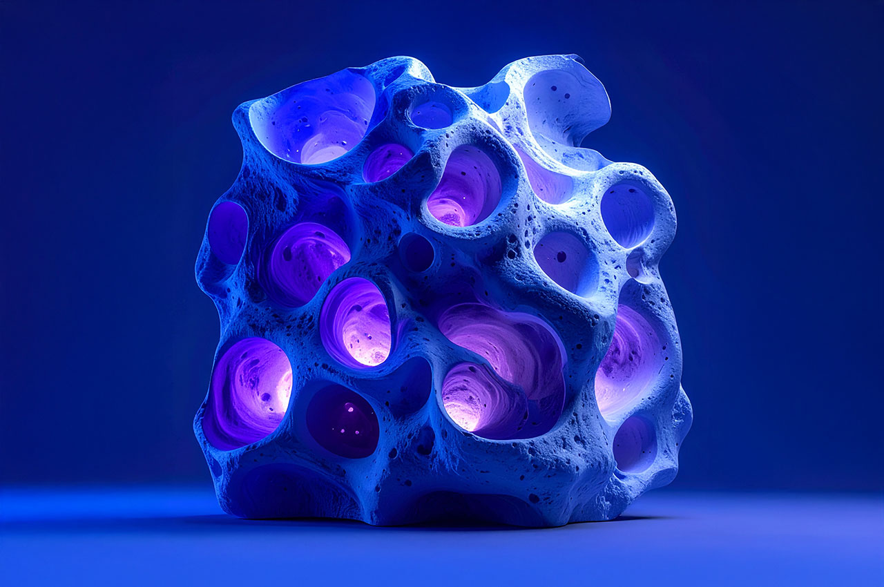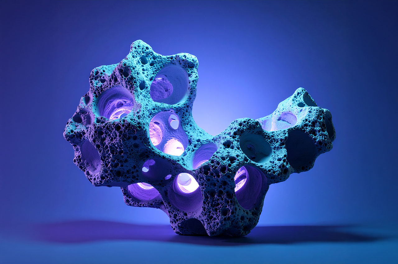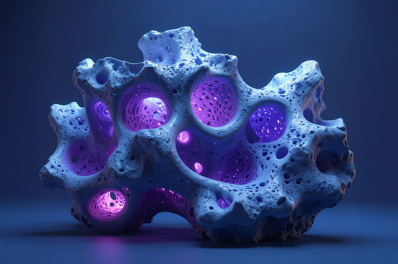 Die Formen erinnern an Korallen, Meteoriten, Knochenfragmente oder an von Wasser ausgehöhlte Steine – doch sie tragen die glatte Präzision einer digitaler Skulptur.